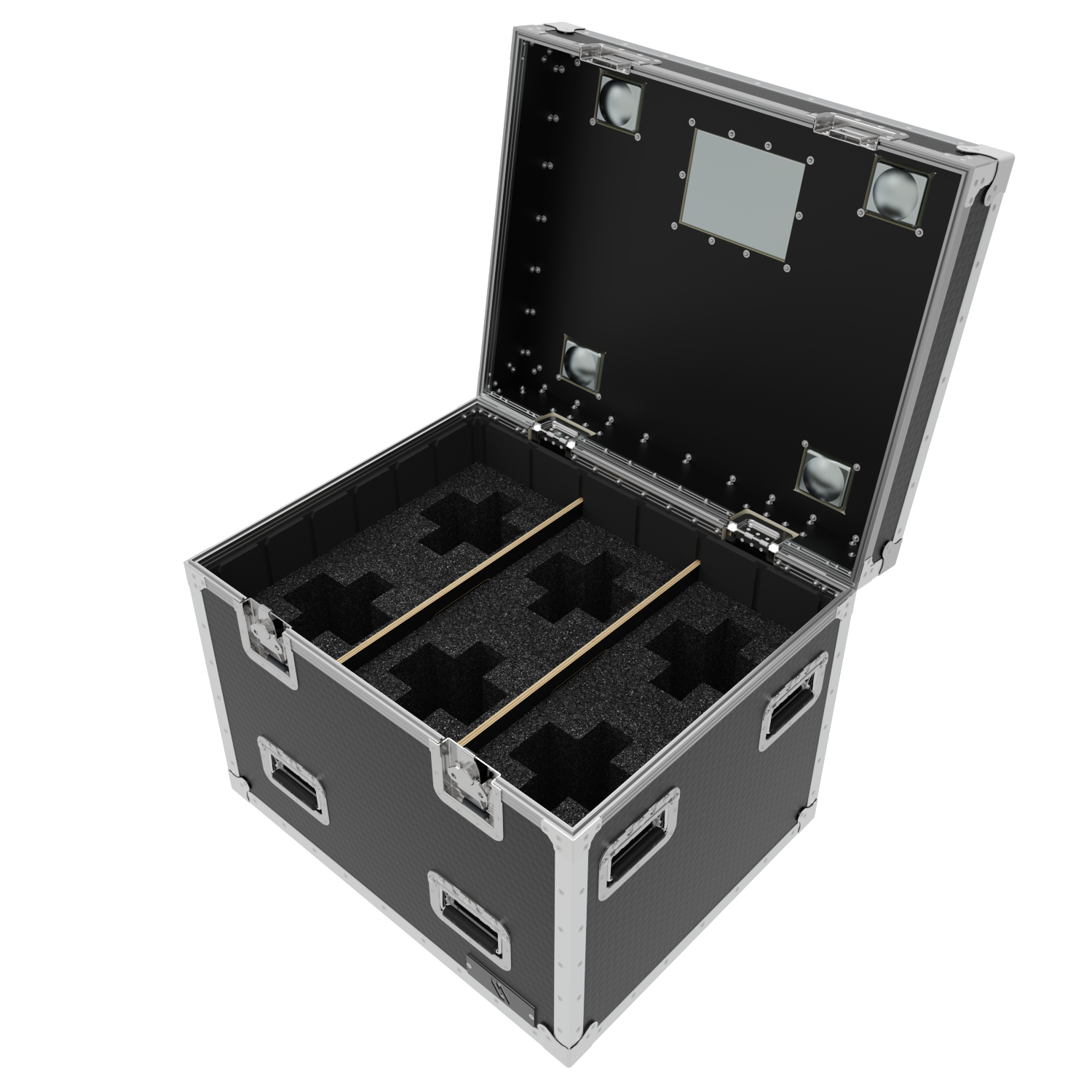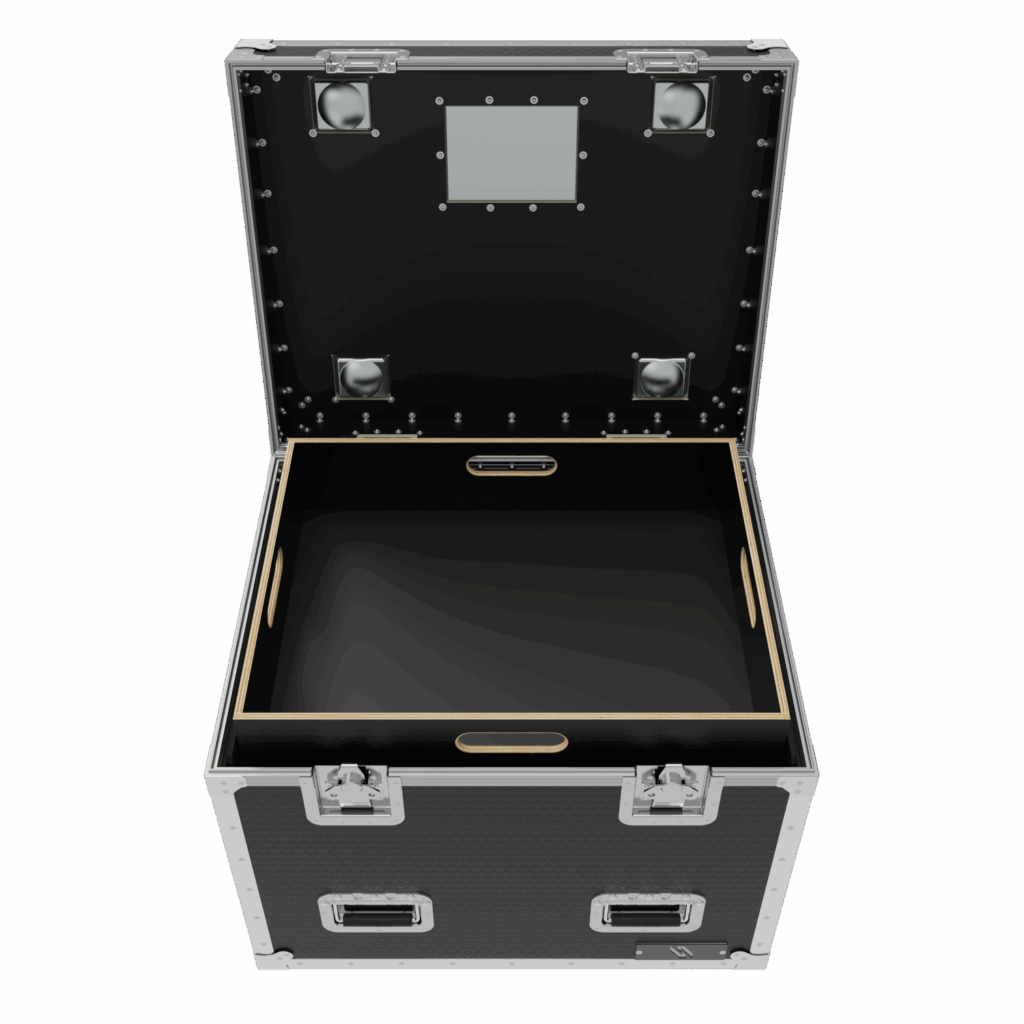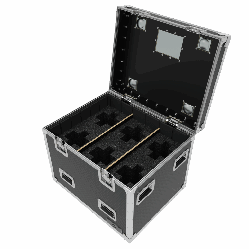The Road Case is equipped with self locating, locking casters. This allows cases to stack easily. The 1/4 truck pack size ensures efficient use of valuable shipping space. 24″ x 30″ x 30″.