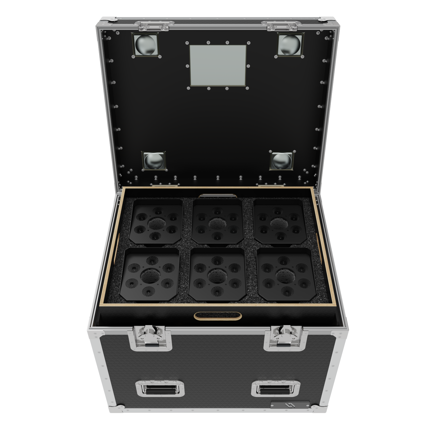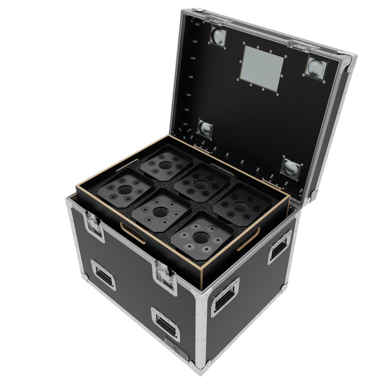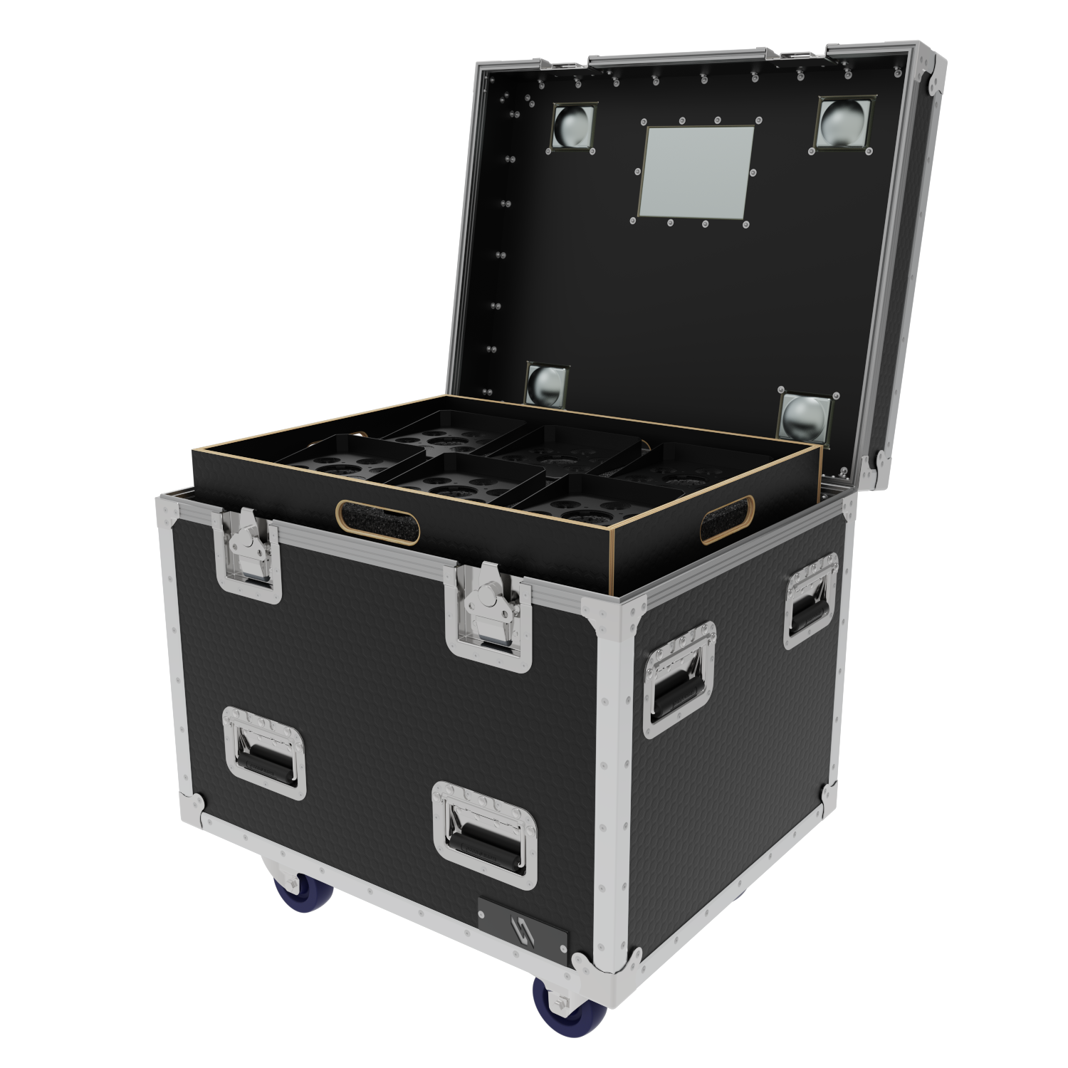 The Road Case is equipped with self locating, locking casters. This allows cases to stack easily. The 1/4 truck pack size ensures efficient use of valuable shipping space. 24″ x 30″ x 30″.